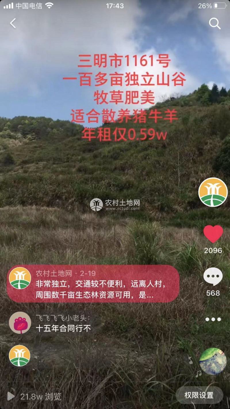三明市1161號100多畝獨立山谷牧草肥美適合散養豬牛羊