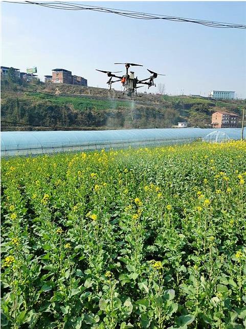 在專家的現場指導下,農戶們有的背上噴霧器、有的駕駛著無人機游走在田間,開始辛勤的勞作。機器噴頭噴出一縷縷藥水,形成一簇簇雨霧,均勻地濺灑在油菜花上。成片的油菜抖擻著身姿,在雨霧下迎風招展。